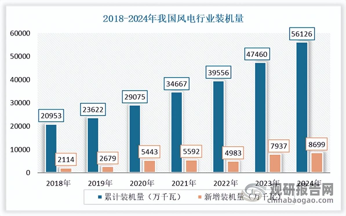 基于对可再生能源的着重和能源转型的需求、邦度策略对可再生能源起色的肆意搀扶及本事进取驱动下的陆续降本提效,我邦风电装机量维持陆续伸长趋向。依据数据显示,截至2024岁终,我邦风机累计装机容量到达561.3GW,较2023年同比上升18.26%。正在2014-2024年时期,我邦风电新增装机容量年均复合伸长率超14%。