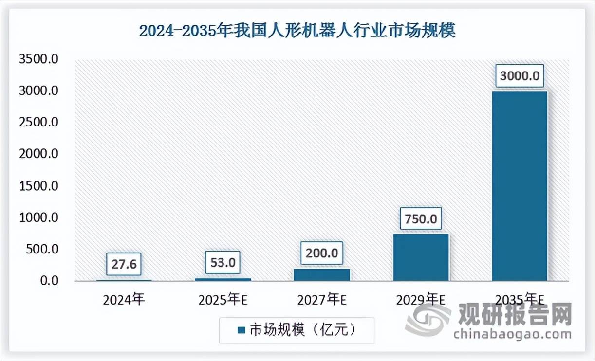 将来五年人形呆板人希望迎来产生式伸长,依据各呆板人厂商的谋划,咱们估计2027年销量希望到达10万台量级。而且,依据2024年首届中邦人形呆板人物业大会颁布的《人形呆板人物业钻探申报》,2024年,中邦人形呆板人墟市范围约27.6亿元,跟着本事进取、使用边界增添以及需求伸长,到2029年,范围希望伸长至750亿元,到2035年进一步增至3000亿元。